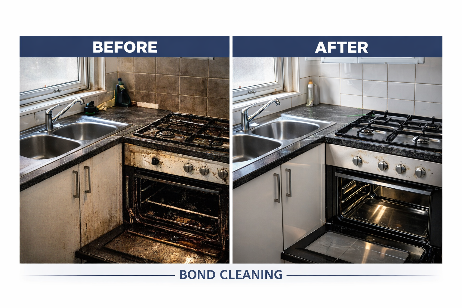 Bond cleaning includes kitchens, bathrooms, living areas, bedrooms, windows (internal), skirting boards, cupboards, appliances, tiles, and carpets.